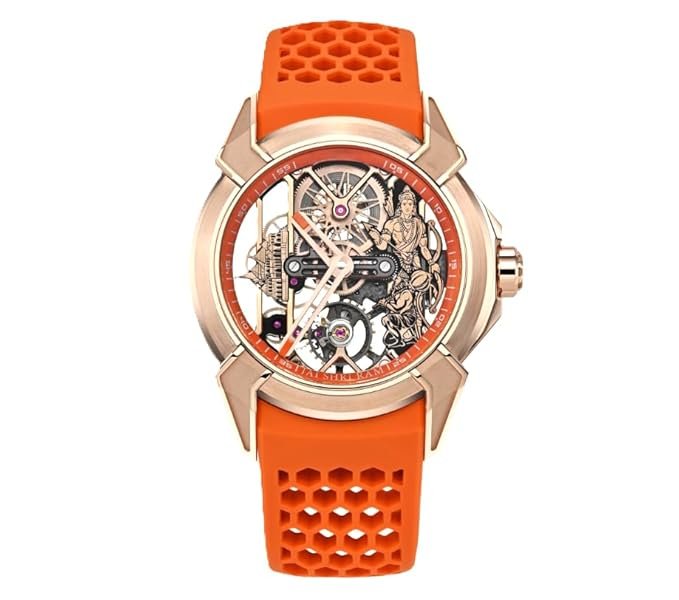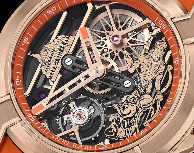 Luxury Automatic Shree Ram Edition Watch for Men– Women Heavy Open Machine Design with Orange Straps, Shri Ram ji & Hanuman ji Artwork, Ayodhya Mandir Dial | Premium Devotional Wristwatch [41mm Bezel] 1Year warranty]